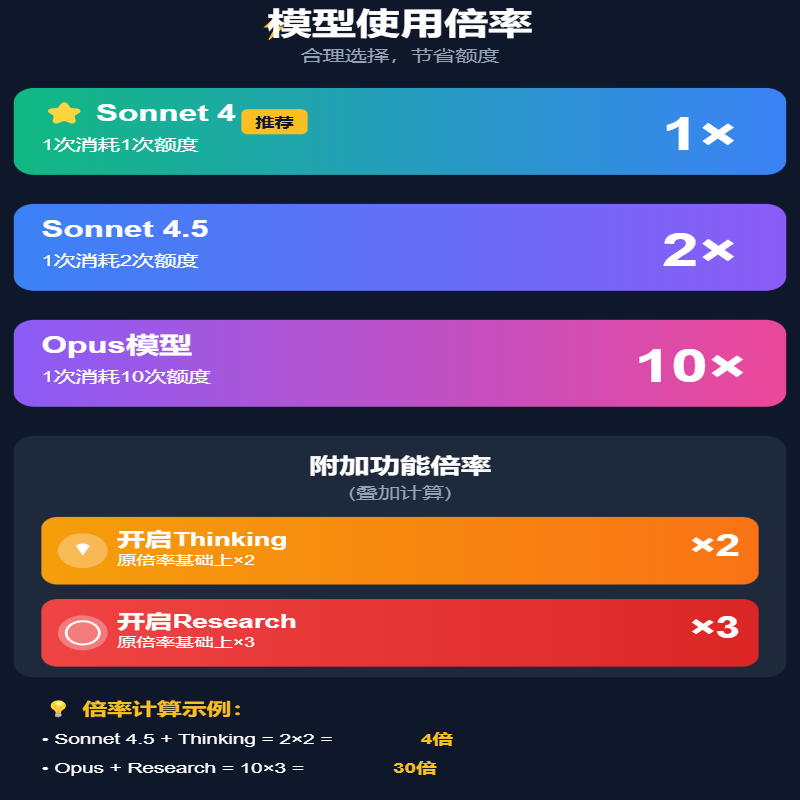 (2)Claude Sonnet 4.5/4、Claude Opus4.1,含Claude Max均可使用,建议晚上22:00以后使用,tokens几乎无限制,推荐使用Claude Sonnet 4,其他模型消耗次数更快,兑换倍率见附图